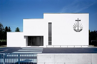 Die Entwurfsüberlegungen folgen den Intentionen der Kirchengemeinde, auf Repräsentation wird vollkommen verzichtet. Die Formgebung leitet sich konsequent von kirchlich liturgischen Inhalten ab, Glocke und Turm sucht man vergeblich. Eine „schwebende Decke“ abstrahiert den Kirchenraum und verliert sich durch Glasspiegelung in der Unendlichkeit. Licht dringt von oben ein und flutet die weißen Wände, ohne dass die Quelle des Lichtes sichtbar in Erscheinung tritt.