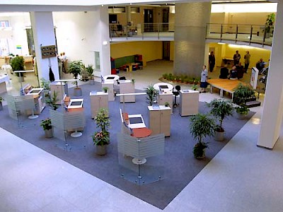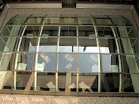 Neue Herausforderungen im modernen Bankwesen mit dem Schwerpunkt der Kundenbetreuung machten einen Totalumbau des Bestandsobjektes erforderlich. Über eine zentrale Glaskuppel wird Tageslicht in die Tiefe des Raumes eingestreut und schafft im Zusammenwirken mit sorgfältig ausgewählten Materialien und Farben eine angenehme Arbeitsatmosphäre. Dem Kundenwunsch nach Pflanzen und Brunnen wurde mit einer raumhohen Wasserskulptur Rechnung getragen.