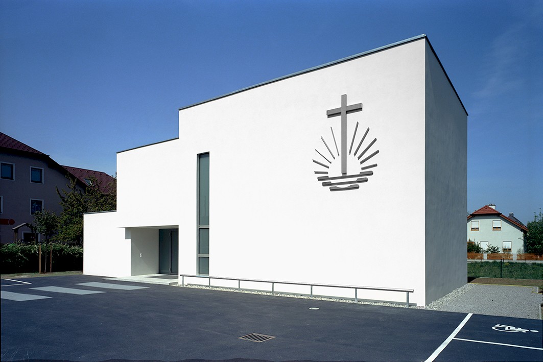 Die Entwurfsüberlegungen folgen den Intentionen der Kirchengemeinde, auf Repräsentation wird vollkommen verzichtet. Die Formgebung leitet sich konsequent von kirchlich liturgischen Inhalten ab, Glocke und Turm sucht man vergeblich. Eine „schwebende Decke“ abstrahiert den Kirchenraum und verliert sich durch Glasspiegelung in der Unendlichkeit. Licht dringt von oben ein und flutet die weißen Wände, ohne dass die Quelle des Lichtes sichtbar in Erscheinung tritt.