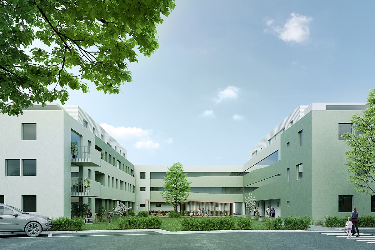 Eine kammartige Bebauungsstruktur entlang der neuen Aufschließungsstraße schafft großzügig durchgrünte Freiräume (Parklandschaft). Ein zentraler Gehweg in Nord-Süd Richtung erschließt die Hauseingänge und führt vorbei an gemeinschaftlichen Einrichtungen wie Sitzplätzen mit Pergolen, Fahrradräumen, Spielflächen und Grünanlagen und schafft eine verkehrsfreie Zone für Kommunikation und Begegnung inmitten der Anlage.