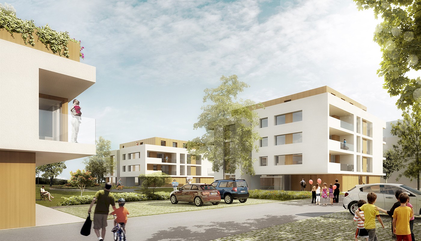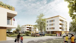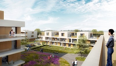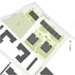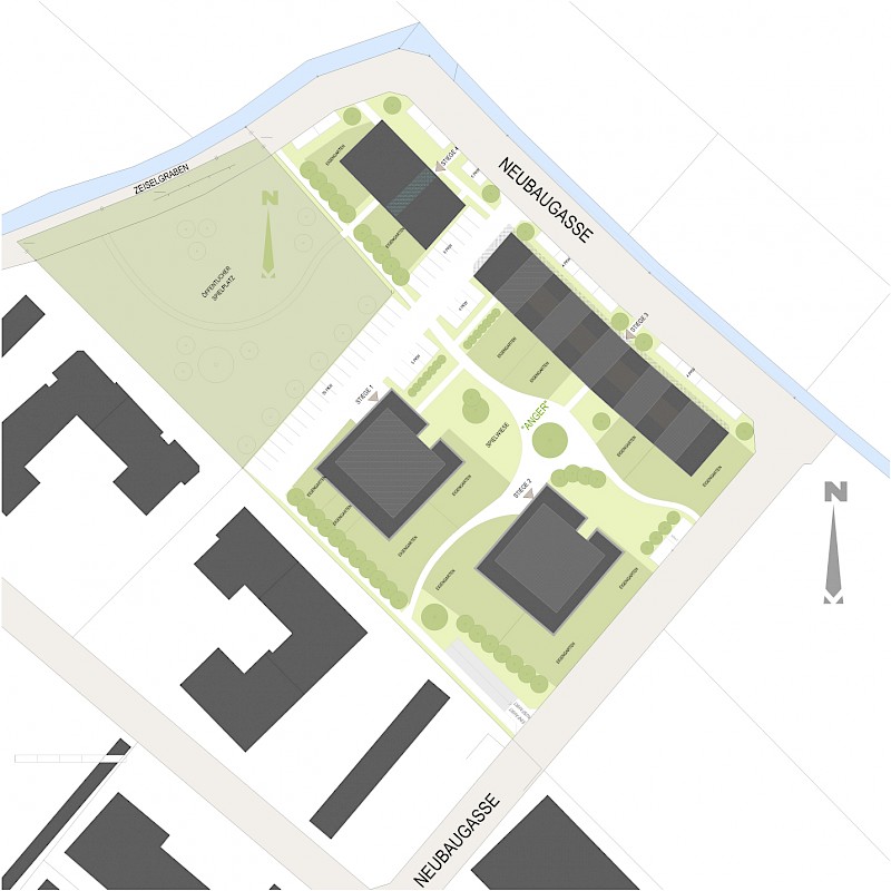 Die einzelnen Baukörper der geplanten Anlage gruppieren sich um einen großzügig begrünten Freiraum, welcher durch Gehwege mit der Umgebung vernetzt und weitgehend verkehrsfrei ist. Somit kann er sowohl als gemeinschaftliche Grünfläche mit Kleinkinderspielplatz als auch als private Eigengärten vor den EG-Wohnungen genutzt werden und steht auch für Anlieferung- und Einsatzfahrzeuge bereit.
